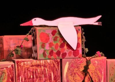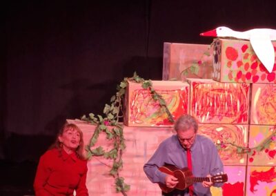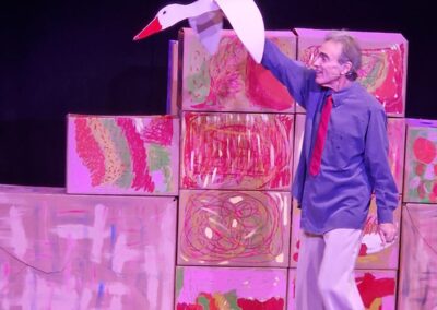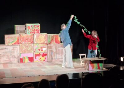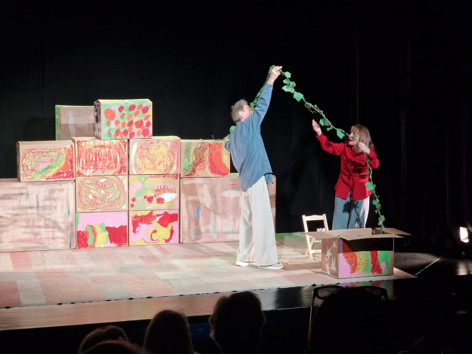 🌿 Desde un espacio aparentemente vacío, la escena comienza a llenarse de vida. A través del movimiento, la música, la palabra y el juego visual, los intérpretes van creando un pequeño universo en el que aparecen el viento, una cigüeña, semillas, una casita, enredaderas, flores y calabazas. Todo sucede de manera orgánica, respetando los tiempos, la mirada y la sensibilidad de los más pequeños.